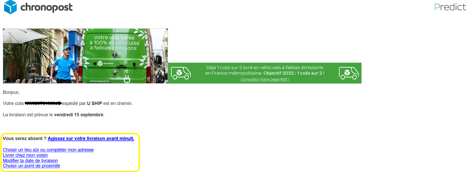 Este correo electrónico te permite de seguir tu paquete, de tener informaciones sobre la fecha y la hora de entrega previstas y de modificar la fecha y el lugar de entrega.